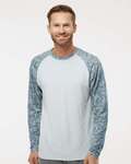 Paragon Adult Panama Sleeve Print Water Pattern Raglan T-shirt. An island-themed twist on the classic color block long sleeved tee. Panama features our open water pattern sublimated on the sleeves and neck leaving a solid color body, perfect for additional printed decoration. The 93% Microfiber Polyester/7% Spandex fabric provides comfort stretch, moisture wicking and anti-microbial capabilities, as well as UPF50+ sun protection. Other features include ParagonXP tear away label, hemmed sleeves and bottom. 4.4 oz