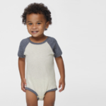 Rabbit Skins 5 Ounce Infant Unisex Baseball Fine Jersey Bodysuit. 5.0 oz. 100% combed ringspun cotton 1x1 fine jersey rib. Flatlock seams. Double-needle ribbed binding on neck and shoulders. Raw serge hem sleeves and bottom. Innovative snap closure. White is sewn with 100% cotton thread. CPSIA Compliant-tracking label in side seam. Sleeves are double needle hem raglan short sleeves. Bottom has contrast double needle ribbed binding on leg opening. Reinforced three snap closure. Side seam construction. Ships from Ball Ground, GA